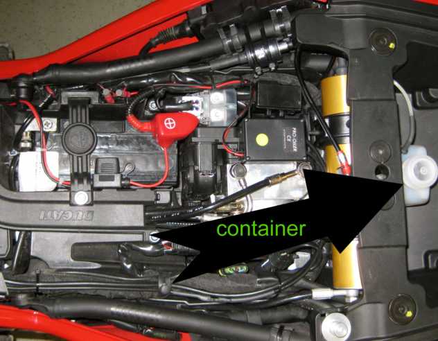 ![]() The controller is mounted in this case on a fabricated bracket, but can also be fitted on the fairing with the dual sided tape (included) ![]() Pump and Junction box are installed under the seat ![]() Oil container is installed under the seat ![]() The 12V power supply ![]() Nozzle bracket bolted to the swingarm protector, no drilling required |
