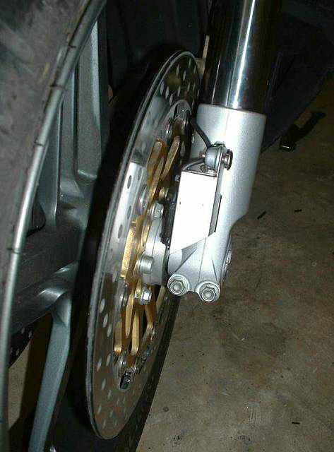Reed switch setup. The reed switch is fixed to a custom bracket on the l/h fork leg, and the magnet fitted into a socket-head bolt, replacing the standard disc bolt Note: The Caponord and Futura both have an electronic speedometer, but use a 2-wire inductive type sensor - unfortunately, the signal generated by this sensor is too weak for the Pro-Oiler to read. On all other Aprilia V2's, the read switch and magnet setup is replaced by a tap from the electronic speedo sensor, which uses the typical Hall-effect type sensor. Click here for more info |
